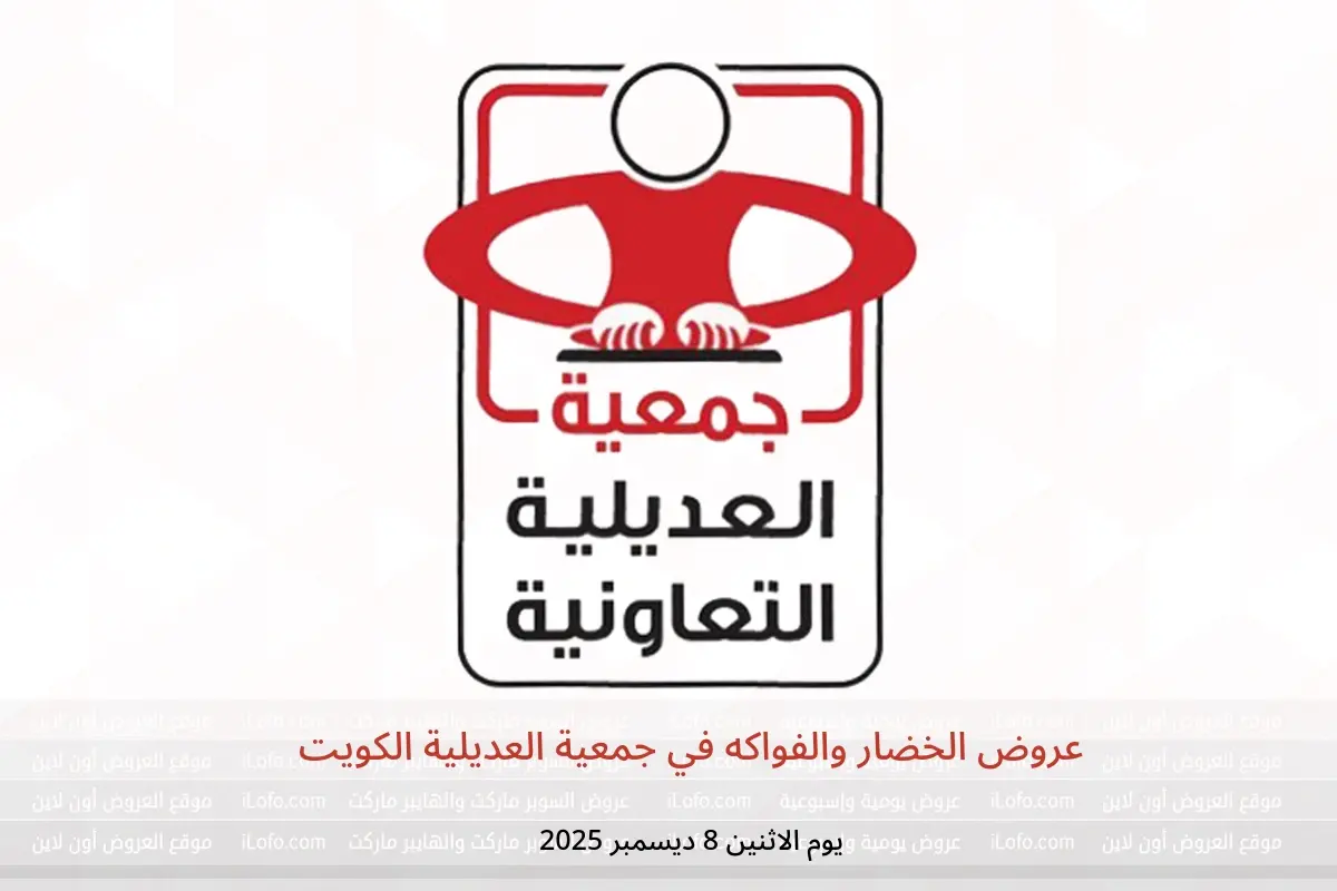 صور وأسعار عروض الخضار والفواكه في جمعية العديلية الكويت المعروضة هنا لأغراض توضيحية فقط ومتاحة من الاثنين, 8 ديسمبر 2025 حتي الاثنين, 8 ديسمبر 2025 ،من i L O F O . C O M.
