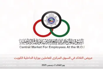 السوق المركزى للعاملين بوزارة الداخلية الكويت تعلن عن تخفيضات جديدة بعنوان « عروض الثلاثاء » المتوفرة حتي يوم 2 ديسمبر 2025, عروض جديدة وأسعار فقط في الكويت.