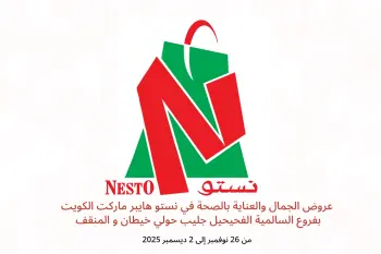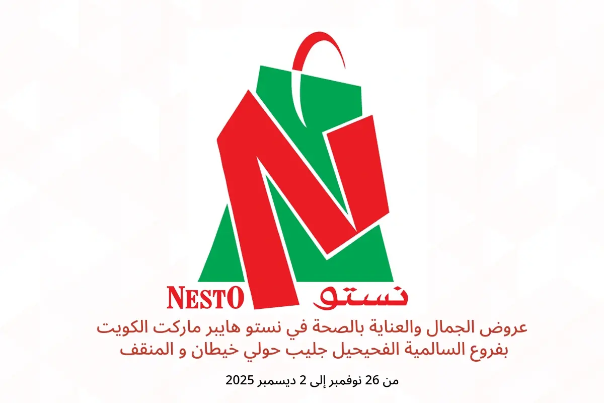 نستو هايبر ماركت الكويت بفروع حولي الفحيحيل خيطان السالمية جليب و المنقف تعلن عن تخفيضات جديدة بعنوان « عروض الجمال والعناية بالصحة » المتوفرة حتي يوم 2 ديسمبر 2025, عروض جديدة وأسعار فقط في الكويت.