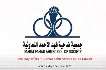 Dahiat Fahd Ahmed co-op Kuwait announces new discounts titled « One day offers » available until 9 December 2025, new offers and prices only in Kuwait.