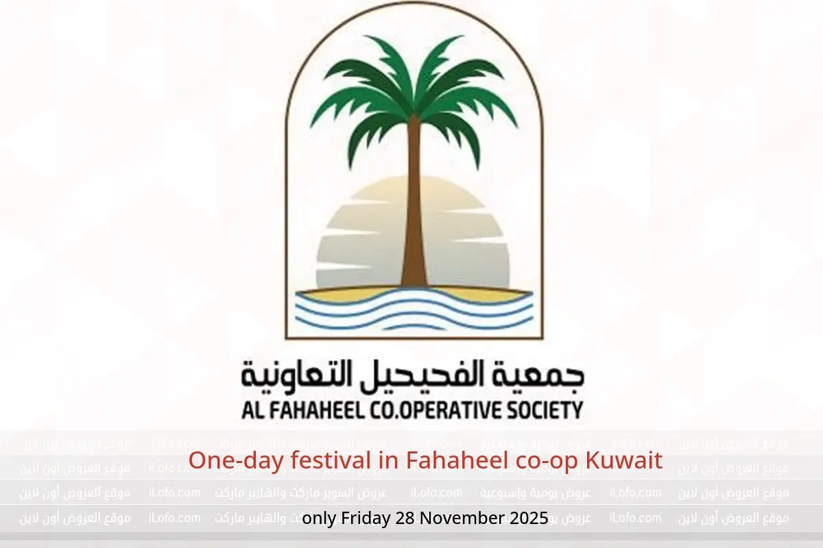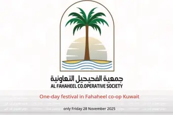 Fahaheel co-op Kuwait announces new discounts titled « One-day festival » available until 28 November 2025, new offers and prices only in Kuwait.