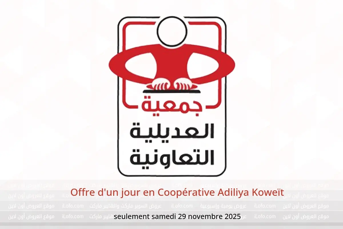 Coopérative Adiliya Koweït annonce de nouvelles réductions intitulées « Offre d'un jour » disponibles jusqu'au 29 novembre 2025, de nouvelles offres et prix uniquement en Koweït.