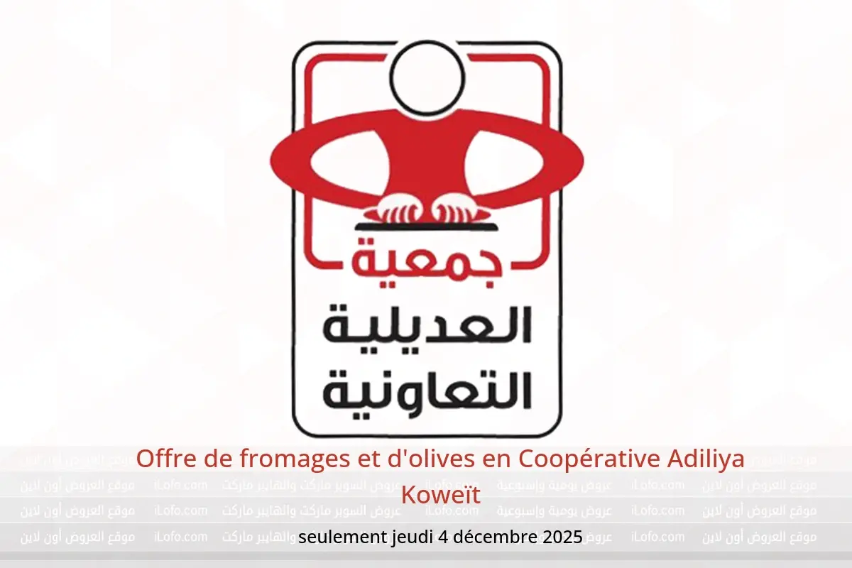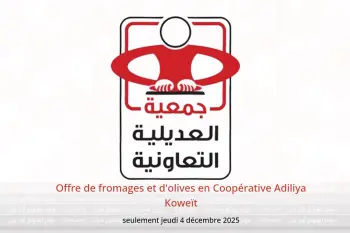 Coopérative Adiliya Koweït annonce de nouvelles réductions intitulées « Offre de fromages et d'olives » disponibles jusqu'au 4 décembre 2025, de nouvelles offres et prix uniquement en Koweït.