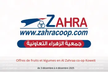 Al Zahraa co-op Koweït annonce de nouvelles réductions intitulées « Offres de fruits et légumes » disponibles jusqu'au 4 décembre 2025, de nouvelles offres et prix uniquement en Koweït.
