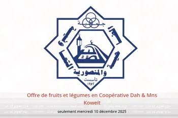 Coopérative Dah & Mns Koweït annonce de nouvelles réductions intitulées « Offre de fruits et légumes » disponibles jusqu'au 10 décembre 2025, de nouvelles offres et prix uniquement en Koweït.