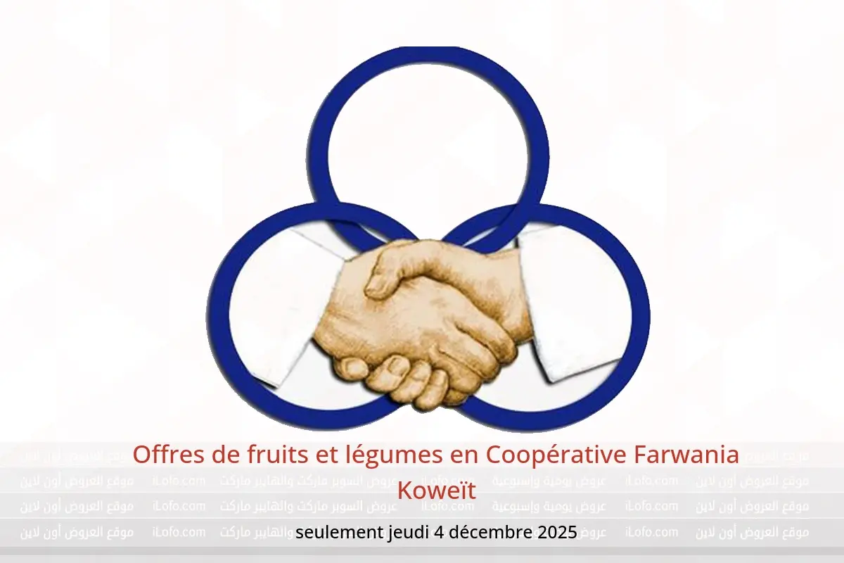 Coopérative Farwania Koweït annonce de nouvelles réductions intitulées « Offres de fruits et légumes » disponibles jusqu'au 4 décembre 2025, de nouvelles offres et prix uniquement en Koweït.
