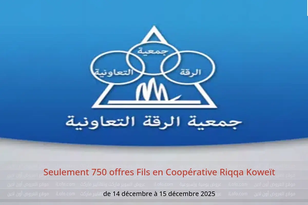 Coopérative Riqqa Koweït annonce de nouvelles réductions intitulées « Seulement 750 offres Fils » disponibles jusqu'au 15 décembre 2025, de nouvelles offres et prix uniquement en Koweït.
